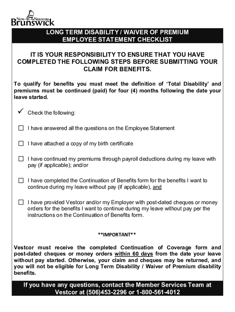 LONG TERM DISABILITY / WAIVER OF PREMIUM EMPLOYEE STATEMENT CHECKLIST IT IS YOUR RESPONSIBILITY TO ENSURE THAT YOU HAVE COMPLETED THE FOLLOWING STEPS BEFORE SUBMITTING YOUR CLAIM FOR BENEFITS. To