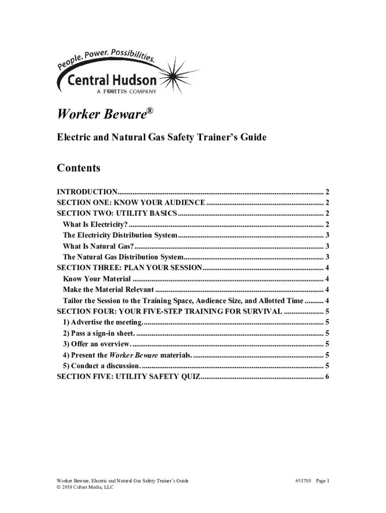 Worker Beware Electric and Natural Gas Safety Trainers GuideContents INTRODUCTION............................................................................................................. 2 SECTION