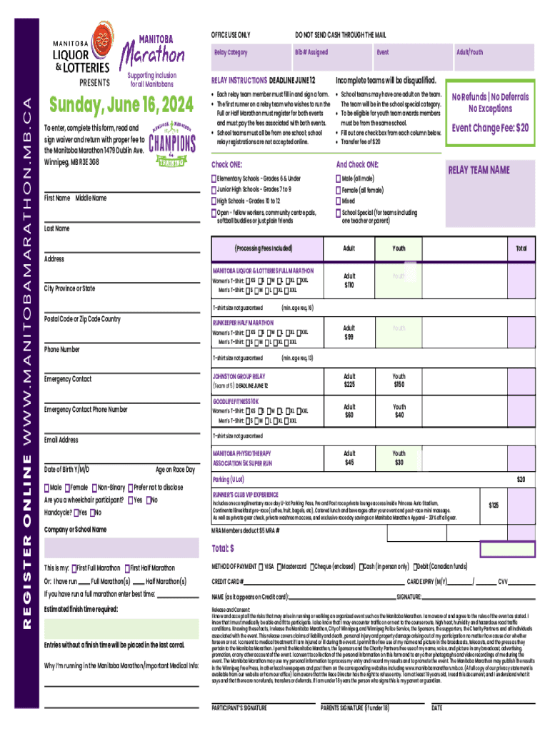 OFFICE USE ONLYDO NOT SEND CASH THROUGH THE MAILRelay CategoryREGISTER ONLINE WWW.MANITOBAMARATHON.MB.CAPRESENTSSupporting inclusion for all ManitobansSunday, June 16, 2024 To enter, complete this
