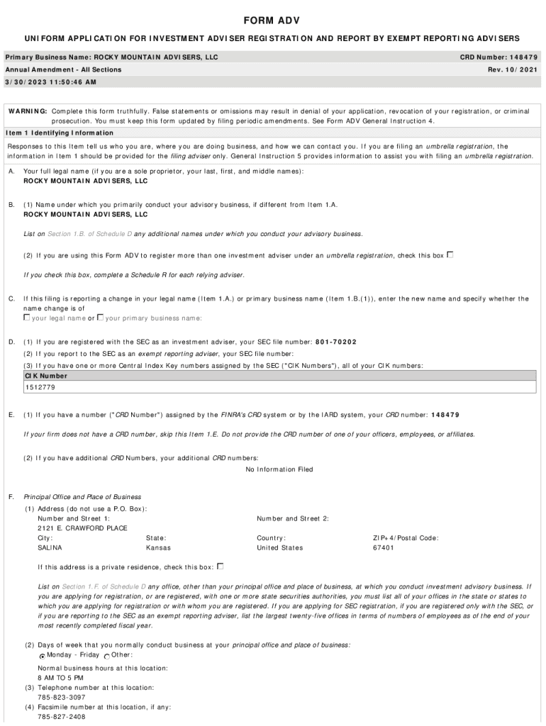 FORM ADV UNIFORM APPLICATION FOR INVESTMENT ADVISER REGISTRATION AND REPORT BY EXEMPT REPORTING ADVISERS Primary Business Name: ROCKY MOUNTAIN ADVISERS, LLCCRD Number: 148479Annual Amendment All SectionsRev.