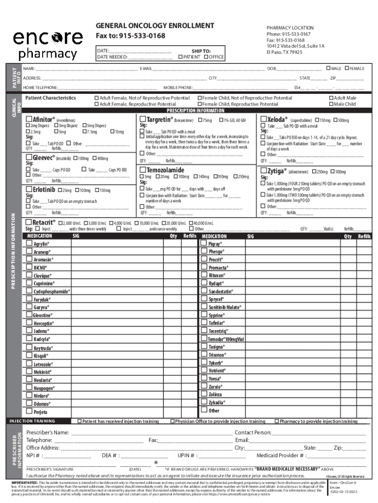 GENERAL ONCOLOGY ENROLLMENT Fax to: 9155330168CLINICAL INFOPATIENT INFODATE:___DATE NEEDED: ___MALEFEMALEADDRESS:___ CITY___ STATE___ ZIP___ HOME TELEPHONE:___Patient CharacteristicsMOBILE PHONE:___Adult
