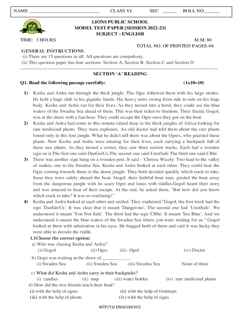 NAME ___CLASS VISEC ___ROLL NO.___LIONS PUBLIC SCHOOL MODEL TEST PAPER [SESSION 202223] SUBJECT : ENGLISH TIME: 3 HOURSM.M: 80 TOTAL NO. OF PRINTED PAGES04GENERAL INSTRUCTIONS: (i) There are 15 questions