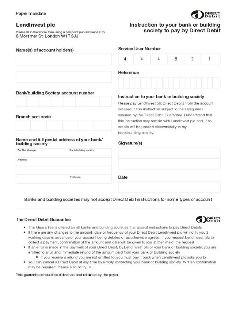 Paper mandateInstruction to your bank or building society to pay by Direct DebitLendInvest plc Please fill in the whole form using a ball point pen and send it to:8 Mortimer St, London W1T 3JJ Name(s)