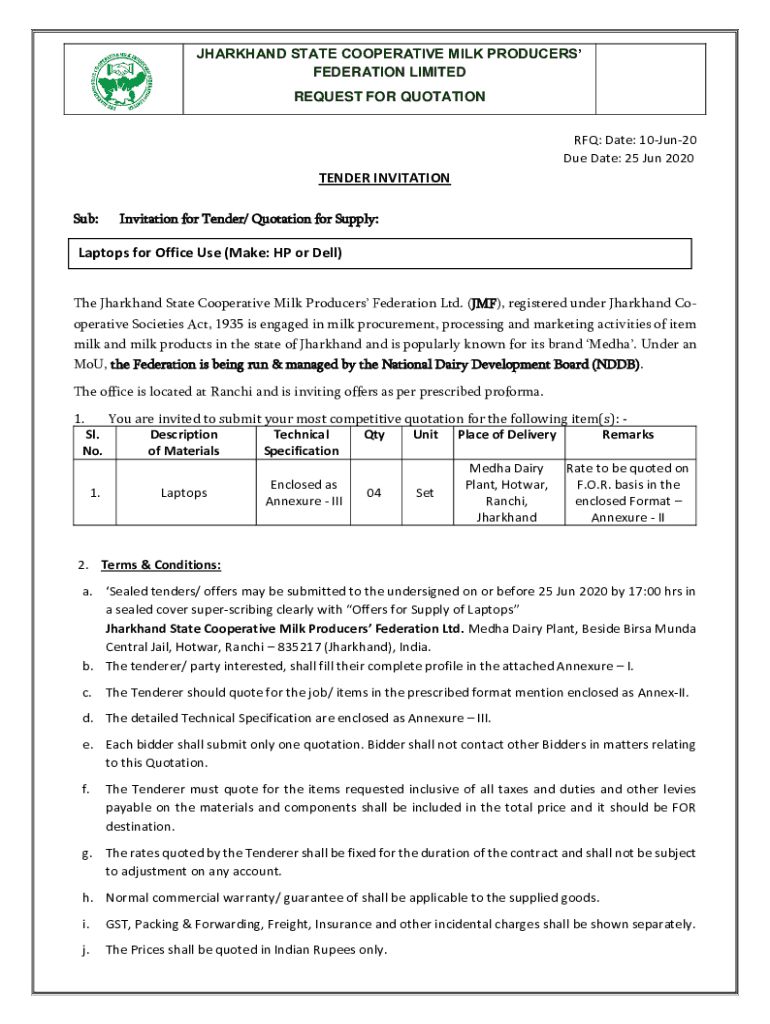 JHARKHAND STATE COOPERATIVE MILK PRODUCERS FEDERATION LIMITED REQUEST FOR QUOTATION RFQ: Date: 10Jun20 Due Date: 25 Jun 2020TENDER INVITATION Sub:Invitation for Tender/ Quotation for Supply:Laptops
