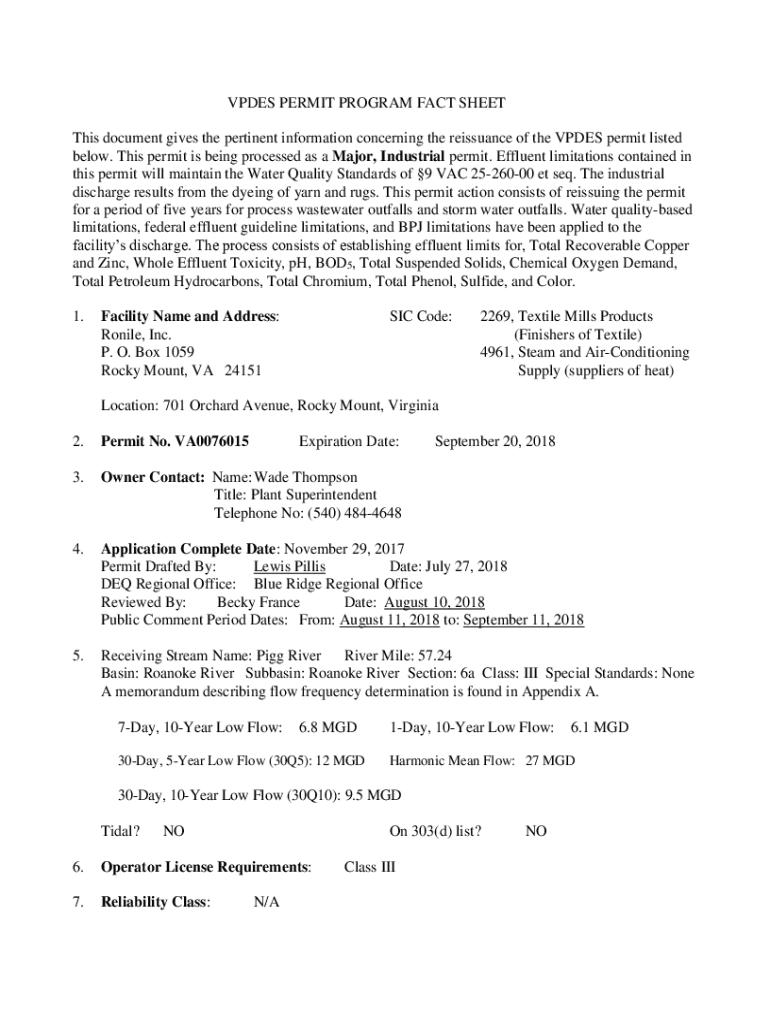 VPDES PERMIT PROGRAM FACT SHEET This document gives the pertinent information concerning the reissuance of the VPDES permit listed below. This permit is being processed as a Major, Industrial permit.