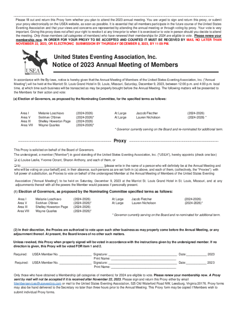 Please fill out and return this Proxy form whether you plan to attend the 2023 annual meeting. You are urged to sign and return this proxy, or submit your proxy electronically on the USEA website,