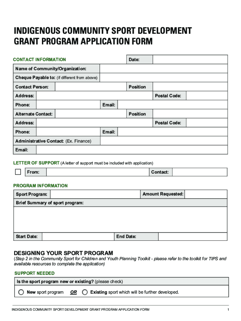 INDIGENOUS COMMUNITY SPORT DEVELOPMENT GRANT PROGRAMAPPLICATION FORM2023INDIGENOUS COMMUNITY SPORT DEVELOPMENT GRANT PROGRAM APPLICATION FORM CONTACT INFORMATIONDate:Name of Community/Organization: