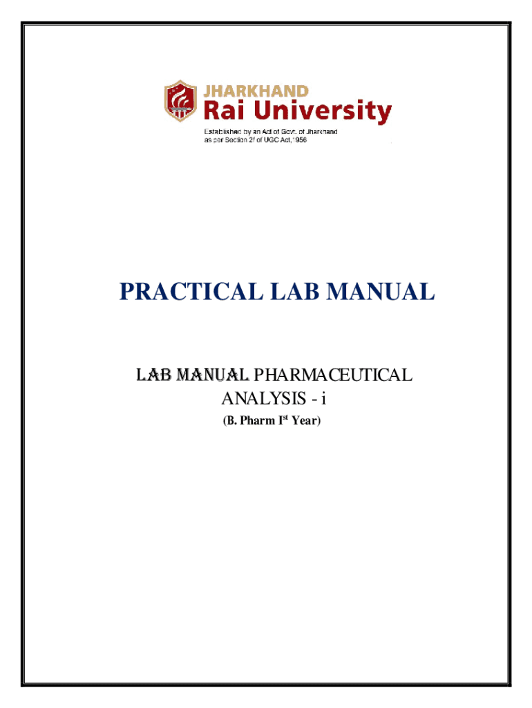 PRACTICAL LAB MANUAL LAB MANUAL PHARMACEUTICAL ANALYSIS i (B. Pharm Ist Year)TABLE OF CONTENT S. No.Name of Experiment1.To study the steps involved in volumetric analysis.2.To prepare and standardize