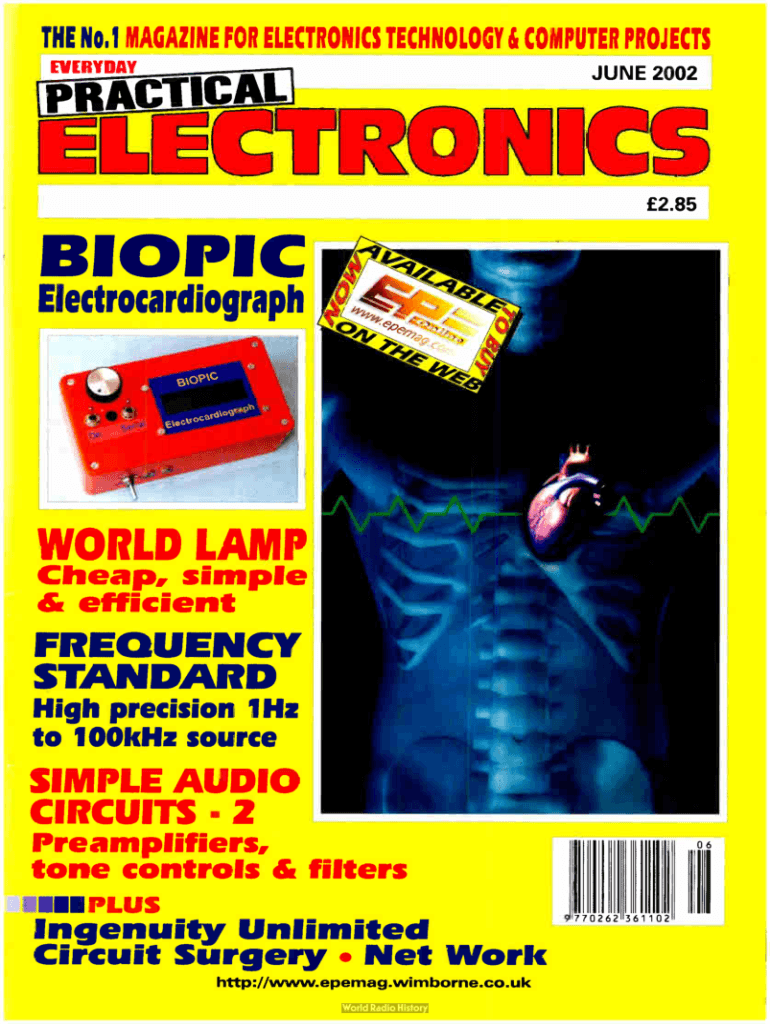 THE Noll MAGAZINE FOR ELECTRONICS TECHNOLOGY itt COMPUTER PROJECTS JUNE 2002EVERYDAYC7 2.85BIOPICElectrocardiographWORLD LAMPCheap, simple lfg efficientFREQUENCY STANDARD High precision 1Hz to 100kHz