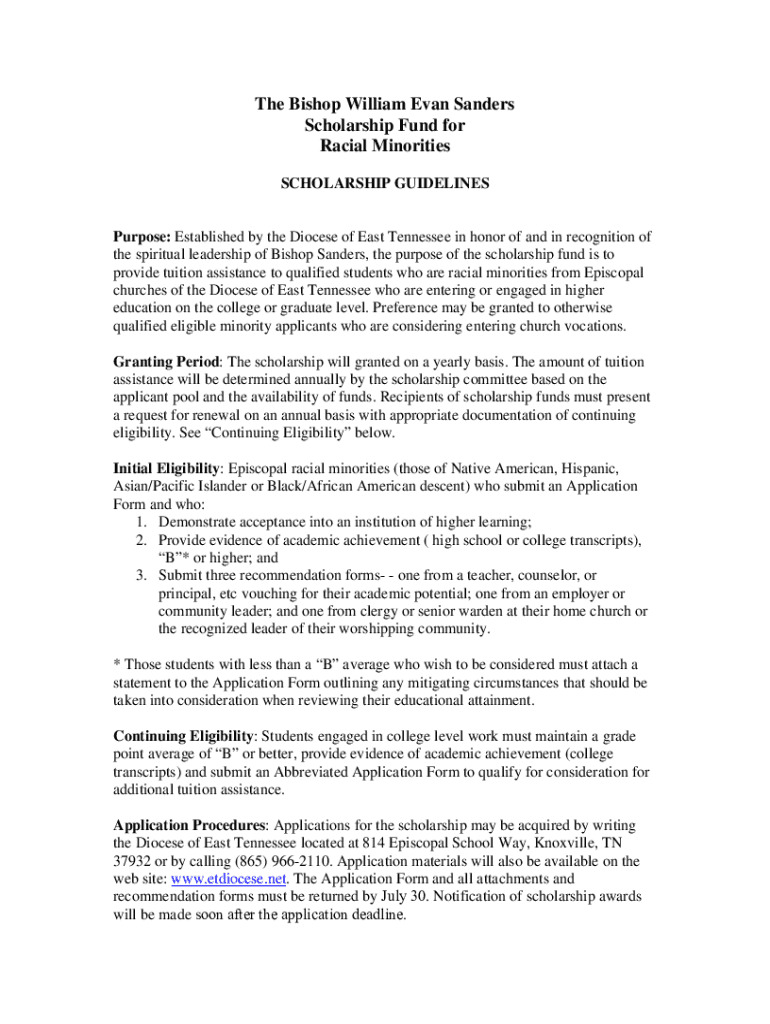 The Bishop William Evan Sanders Scholarship Fund for Racial Minorities SCHOLARSHIP GUIDELINESPurpose: Established by the Diocese of East Tennessee in honor of and in recognition of the spiritual leadership