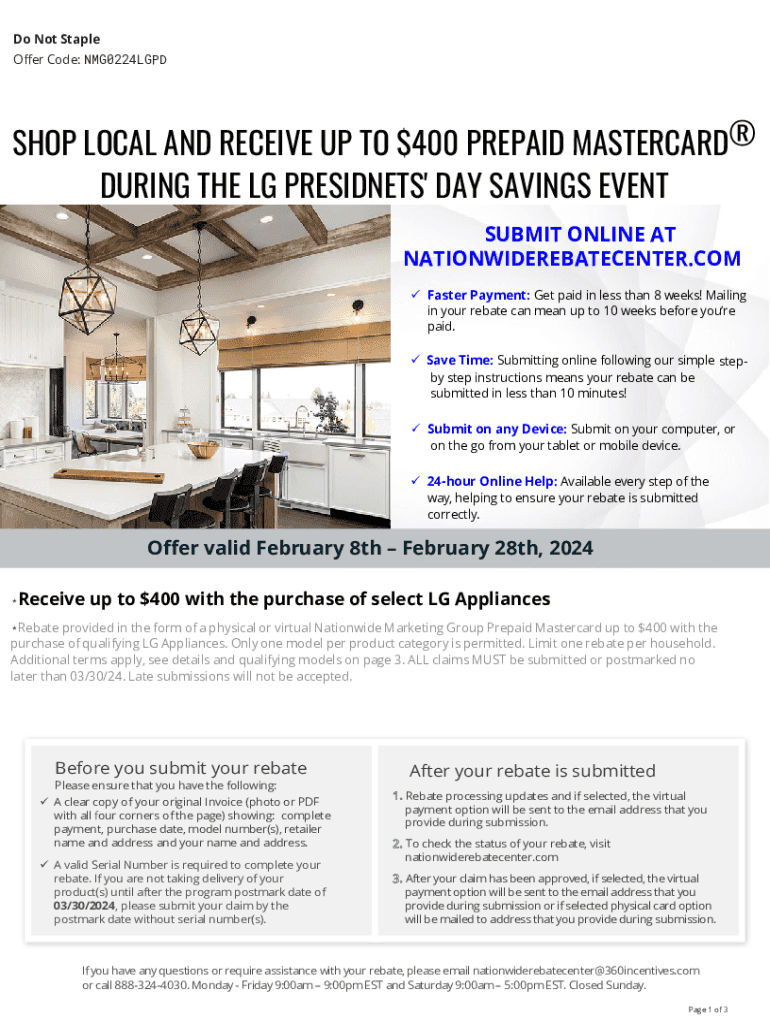 Do Not Staple Oer Code: NMG0224LGPDSHOP LOCAL AND RECEIVE UP TO $400 PREPAID MASTERCARD DURING THE LG PRESIDNETS\' DAY SAVINGS EVENT SUBMIT ONLINE AT NATIONWIDEREBATECENTER.COM Faster Payment: Get