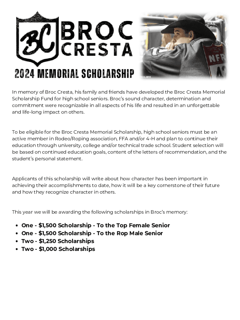 2024 MEMORIAL SCHOLARSHIP In memory of Broc Cresta, his family and friends have developed the Broc Cresta Memorial Scholarship Fund for high school seniors. Brocs sound character, determination and