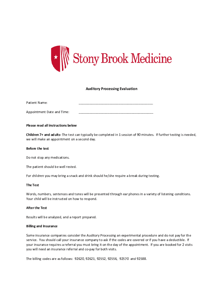 Auditory Processing Evaluation Patient Name:___Appointment Date and Time:___Please read all instructions below Children 7+ and adults The test can typically be completed in 1 session of 90 minutes.