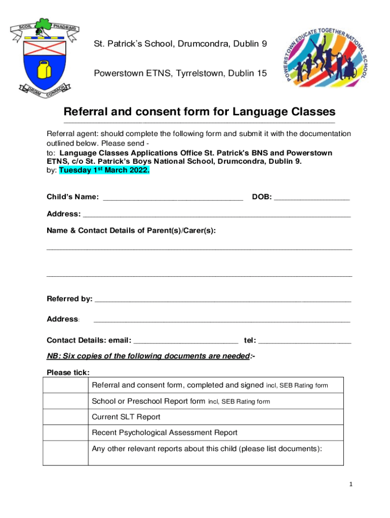St. Patricks School, Drumcondra, Dublin 9Powerstown ETNS, Tyrrelstown, Dublin 15Referral and consent form for Language Classes ___Referral agent: should complete the following form and submit it with