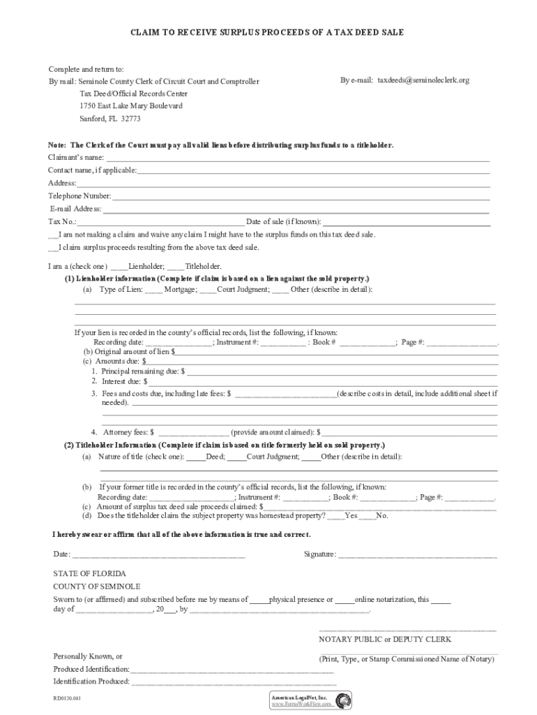 CLAIM TO RECEIVE SURPLUS PROCEEDS OF A TAX DEED SALEComplete and return to: %HPDLO taxdeeds@seminoleclerk.orgBy mail: Seminole County Clerk of Circuit Court and Comptroller Tax Deed/Official Records