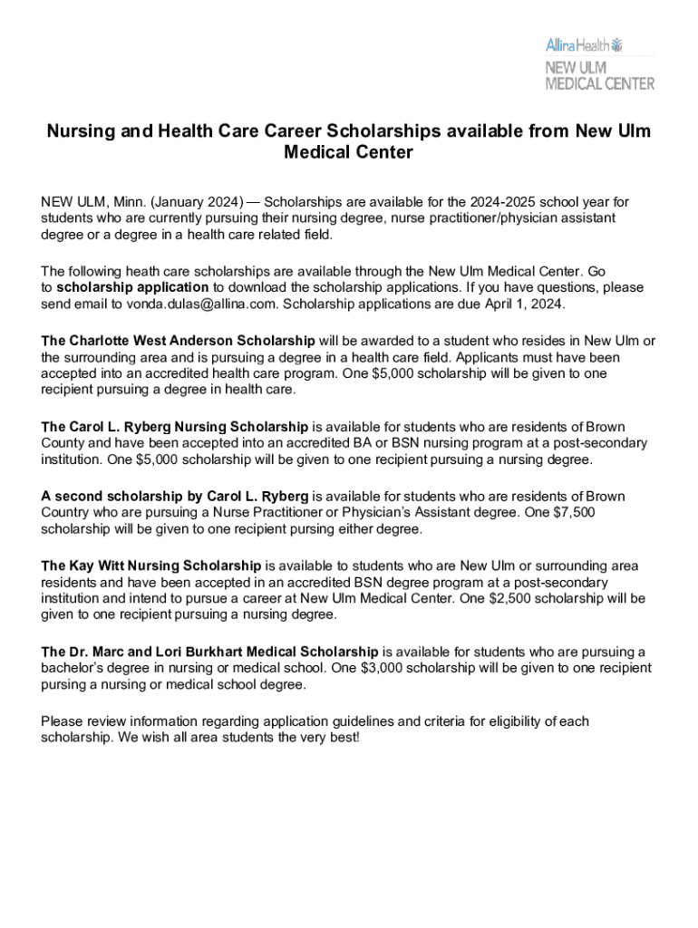 Nursing and Health Care Career Scholarships available from New Ulm Medical Center NEW ULM, Minn. (January 2024) Scholarships are available for the 20242025 school year for students who are currently