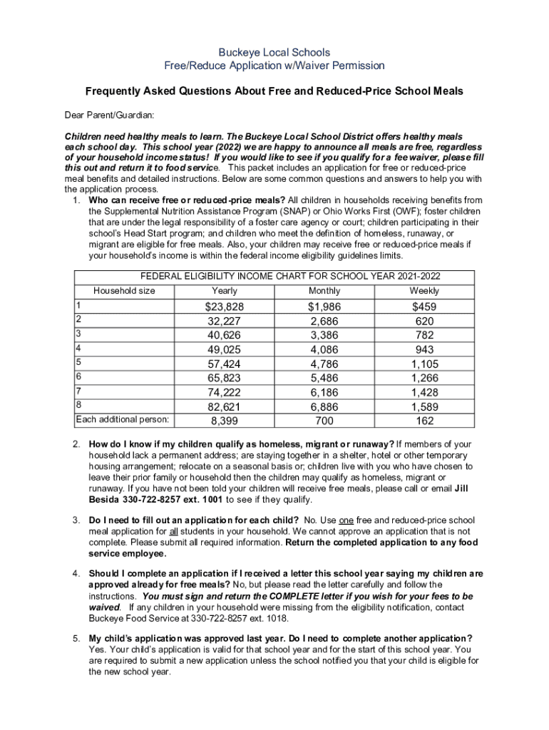 Buckeye Local Schools Free/Reduce Application w/Waiver Permission Frequently Asked Questions About Free and ReducedPrice School Meals Dear Parent/Guardian: Children need healthy meals to learn. The