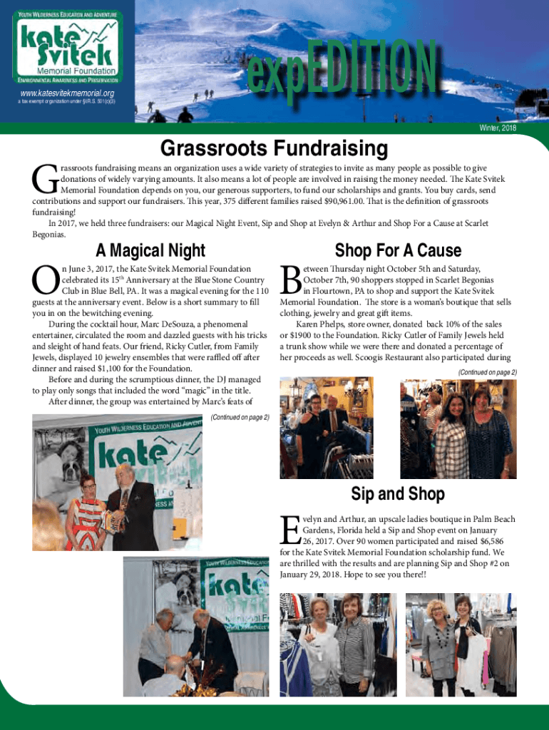Expedition.katesvitekmemorial.organ tax-exempt organization under I.R.S. 501(c)(3)Winter, 2018Grassroots Fundraisingrassroots fundraising means an organization uses a wide variety of strategies to