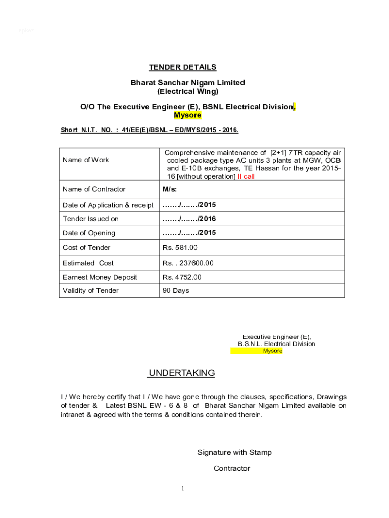 Short N.I.T. NO. : 41/EE(E)/BSNL ED/MYS/2015 2016.Comprehensive