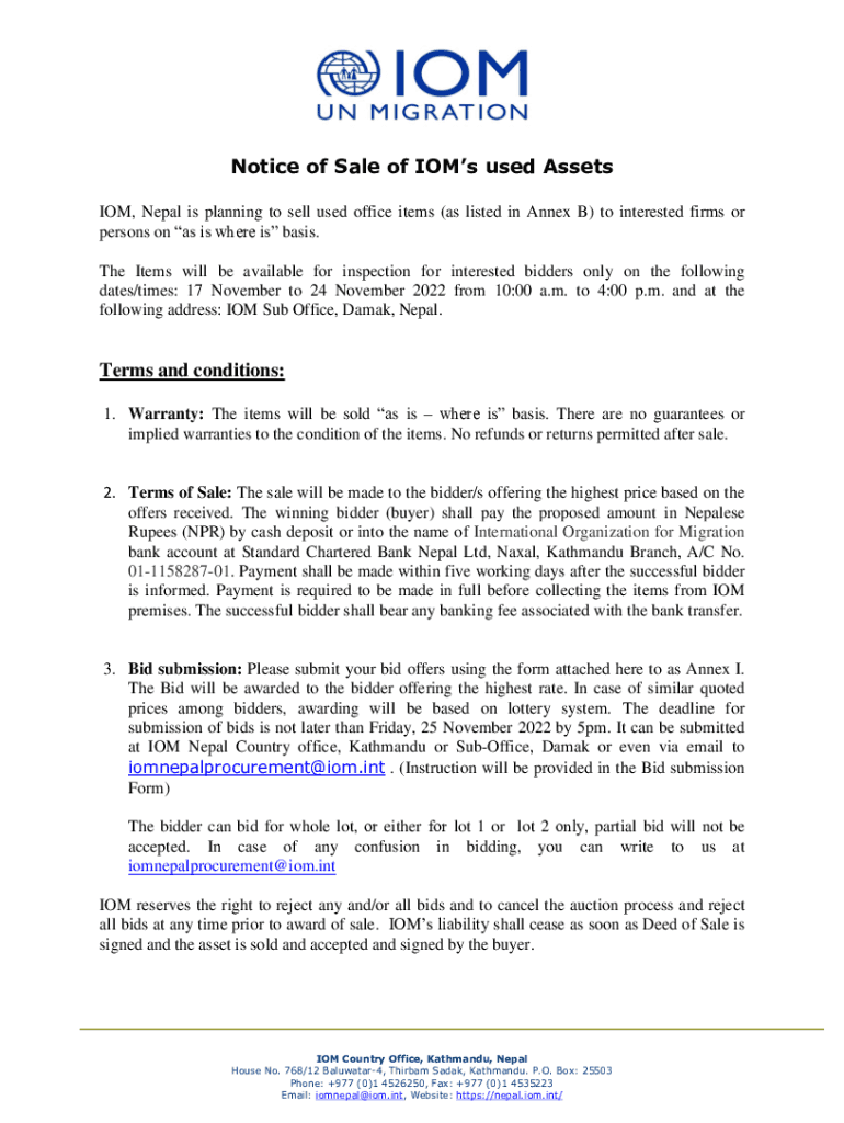 Get the free Notice of Sale of IOM's used Assets Terms and conditions: - nepal iom