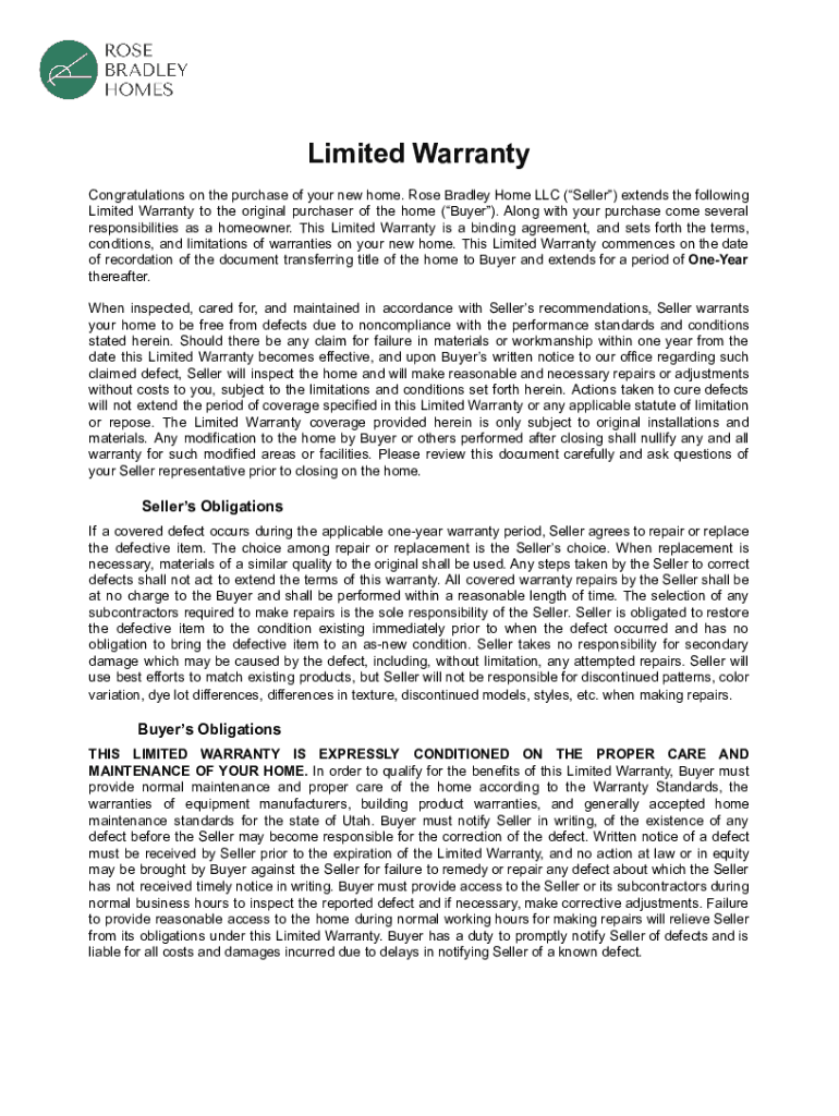 Limited Warranty Congratulations on the purchase of your new home. Rose Bradley Home LLC (Seller) extends the following Limited Warranty to the original purchaser of the home (Buyer). Along with your