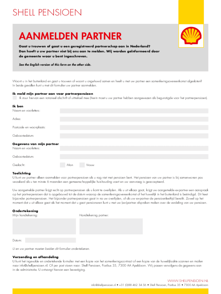 SHELL PENSIOENAANMELDEN PARTNER Gaat u trouwen of gaat u een geregistreerd partnerschap aan in Nederland? Dan hoeft u uw partner niet bij ons aan te melden. Wij worden genformeerd door de gemeente