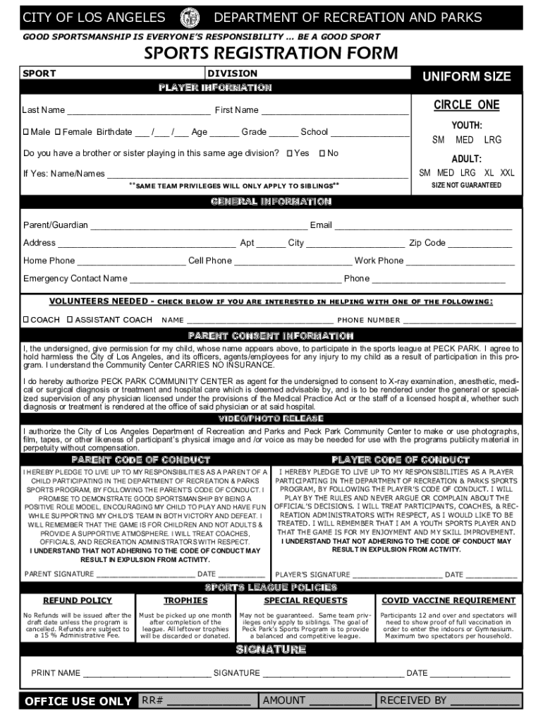 CITY OF LOS ANGELESDEPARTMENT OF RECREATION AND PARKSGOOD SPORTSMANSHIP IS EVERYONES RESPONSIBILITY BE A GOOD SPORTSPORTS REGISTRATION FORM SPORTDIVISIONUNIFORM SIZEPLAYER INFORMATION Last Name ___