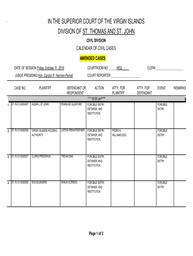 IN THE SUPERIOR COURT OF THE VIRGIN ISLANDS DIVISION OF ST. THOMAS AND ST . JOHN CIVIL DIVISIONCALENDAR OF CIVIL CASES AMENDED CASES DATE OF SESSION Friday, October 11 , 2019COURTROOM NO ___MG2___JUDGE