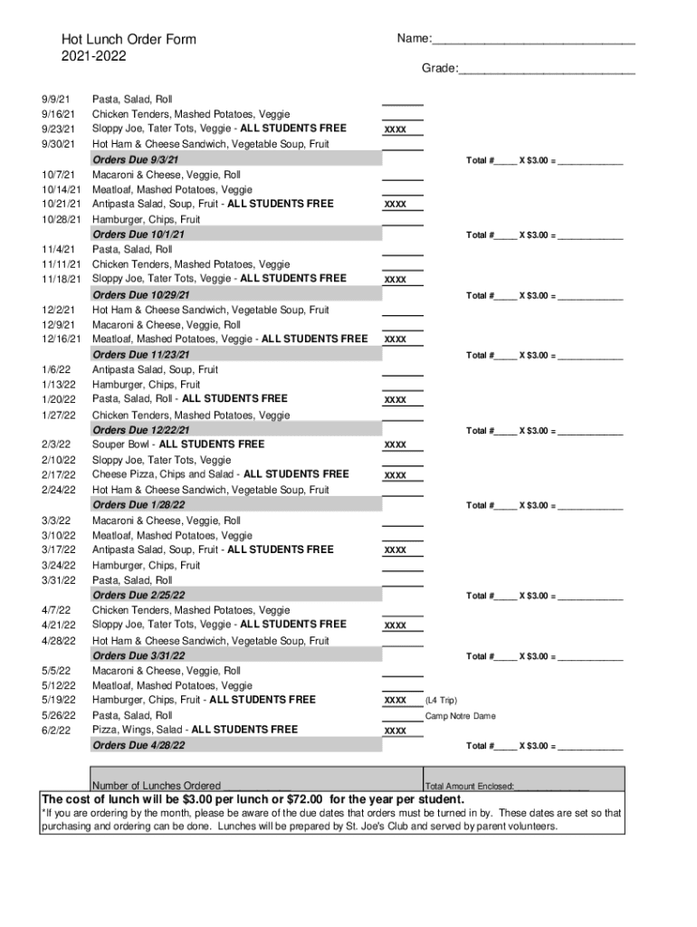 Hot Lunch Order Form 20212022Name:___ Grade:___9/9/21 9/16/21 9/23/21 9/30/21 10/7/21 10/14/21 10/21/21 10/28/21Pasta, Salad, Roll Chicken Tenders, Mashed Potatoes, Veggie Sloppy Joe, Tater Tots,