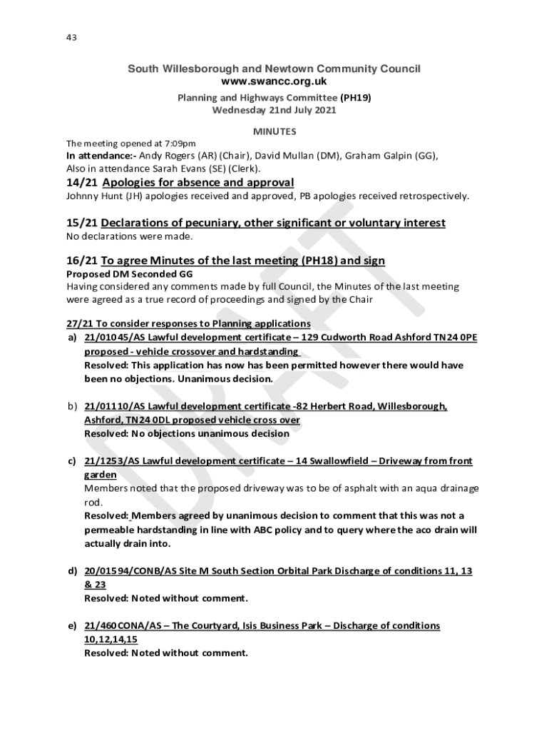 43South Willesborough and Newtown Community Council www.swancc.org.uk Planning and Highways Committee (PH19) Wednesday 21nd July 2021 MINUTES The meeting opened at 7:09pmIn attendance: Andy Rogers