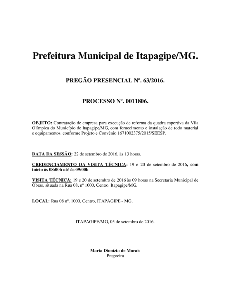 Prefeitura Municipal de Itapagipe/MG. PREGO PRESENCIAL N. 63/2016.PROCESSO N. 0011806.OBJETO: Contratao de empresa para execuo de reforma da quadra esportiva da Vila Olmpica do Municpio de Itapagipe/MG,