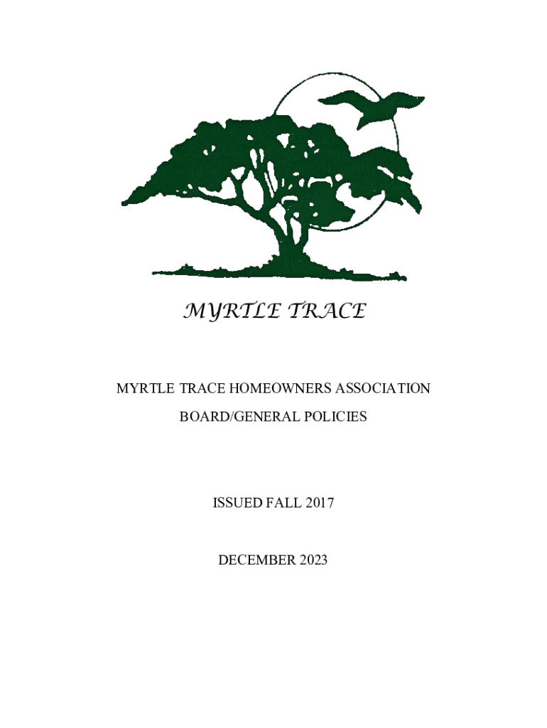 MYRTLE TRACEMYRTLE TRACE HOMEOWNERS ASSOCIATION BOARD/GENERAL POLICIESISSUED FALL 2017DECEMBER 2023CONTENTS Policy on Pets and Feeding and/or Sheltering of Stray/Feral Cats Policy on the Feeding of