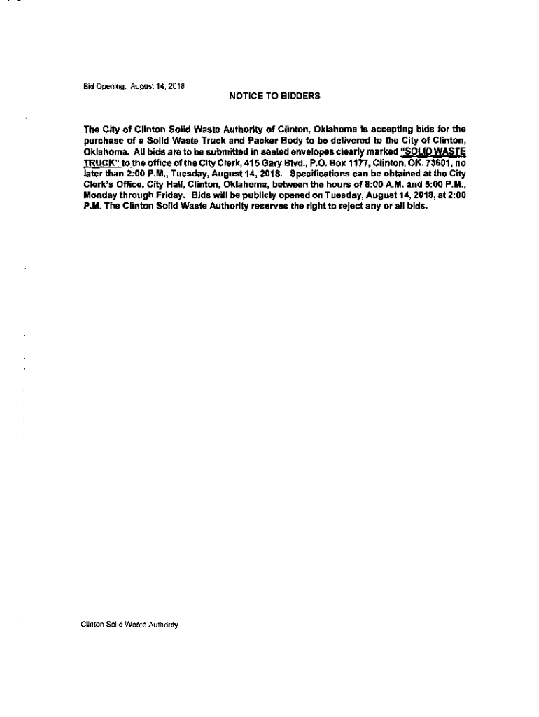 Bid Opening: August 14, 2018NOTICE TO BIDDERSThe City of Clinton Solid Waste Authority of Clinton, Oklahoma is accepting bids for the purchase of a Solid Waste Truck and Packer Body to be delivered