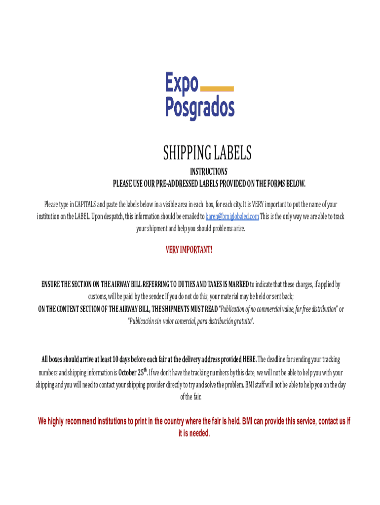 SHIPPING LABELS INSTRUCTIONS PLEASE USE OUR PREADDRESSED LABELS PROVIDED ON THE FORMS BELOW. Please type in CAPITALS and paste the labels below in a visible area in each box, for each city. It is