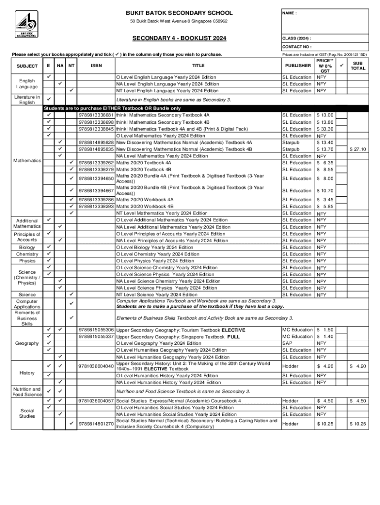 BUKIT BATOK SECONDARY SCHOOLNAME :50 Bukit Batok West Avenue 8 Singapore 658962SECONDARY 4 BOOKLIST 2024CLASS (2024) : CONTACT NO :Please select your books appropriately and tick ( ) in the column