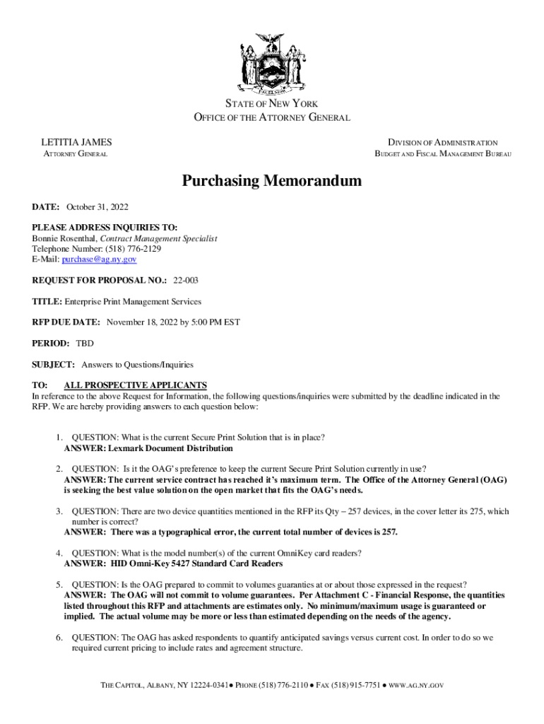 STATE OF NEW YORK OFFICE OF THE ATTORNEY GENERAL LETITIA JAMESDIVISION OF ADMINISTRATIONATTORNEY GENERALBUDGET AND FISCAL MANAGEMENT BUREAUPurchasing Memorandum DATE: October 31, 2022 PLEASE ADDRESS