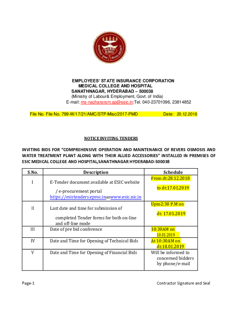 EMPLOYEES STATE INSURANCE CORPORATION MEDICAL COLLEGE AND HOSPITAL SANATHNAGAR, HYDERABAD 500038 (Ministry of Labour& Employment, Govt. of India) Email: msnachararam.ap@esic.in:Tel. 04023701096, 23814852