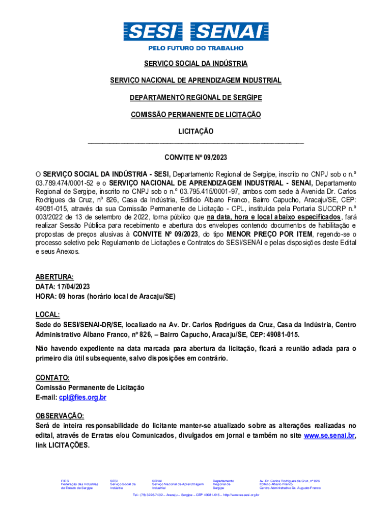 SERVIO SOCIAL DA INDSTRIA SERVIO NACIONAL DE APRENDIZAGEM INDUSTRIAL DEPARTAMENTO REGIONAL DE SERGIPE COMISSO PERMANENTE DE LICITAO LICITAO ___ CONVITE N 09/2023 O SERVIO SOCIAL DA INDSTRIA SESI,