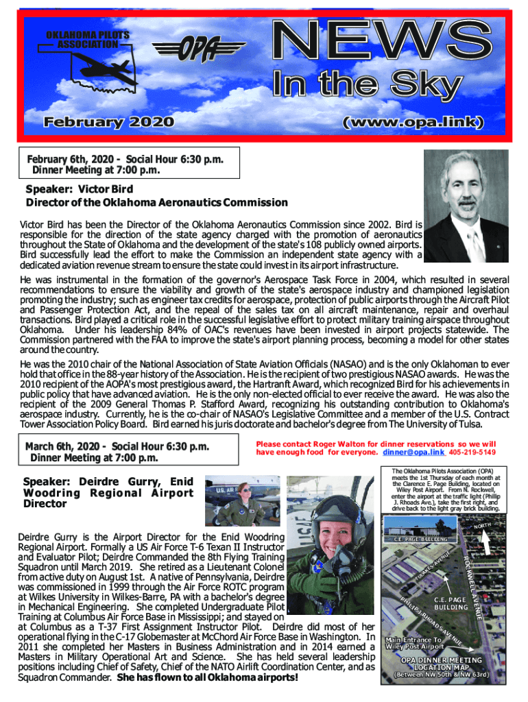OKLAHOMA PILOTS ASSOCIATIONNEWS In the SkyFebruary 2020(www.opa.link)February 6th, 2020 Social Hour 6:30 p.m. Dinner Meeting at 7:00 p.m.Speaker: Victor Bird Director of the Oklahoma Aeronautics Commission