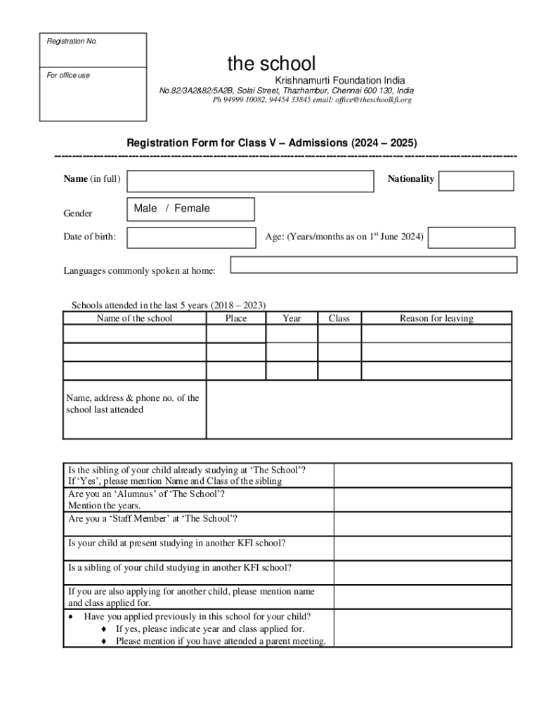 Registration No.the schoolFor office useKrishnamurti Foundation India .No.82/3A2&82/5A2B, Solai Street, Thazhambur, Chennai 600 130, India Ph 94999 10082, 94454 33845 email: office@theschoolkfi.orgRegistration