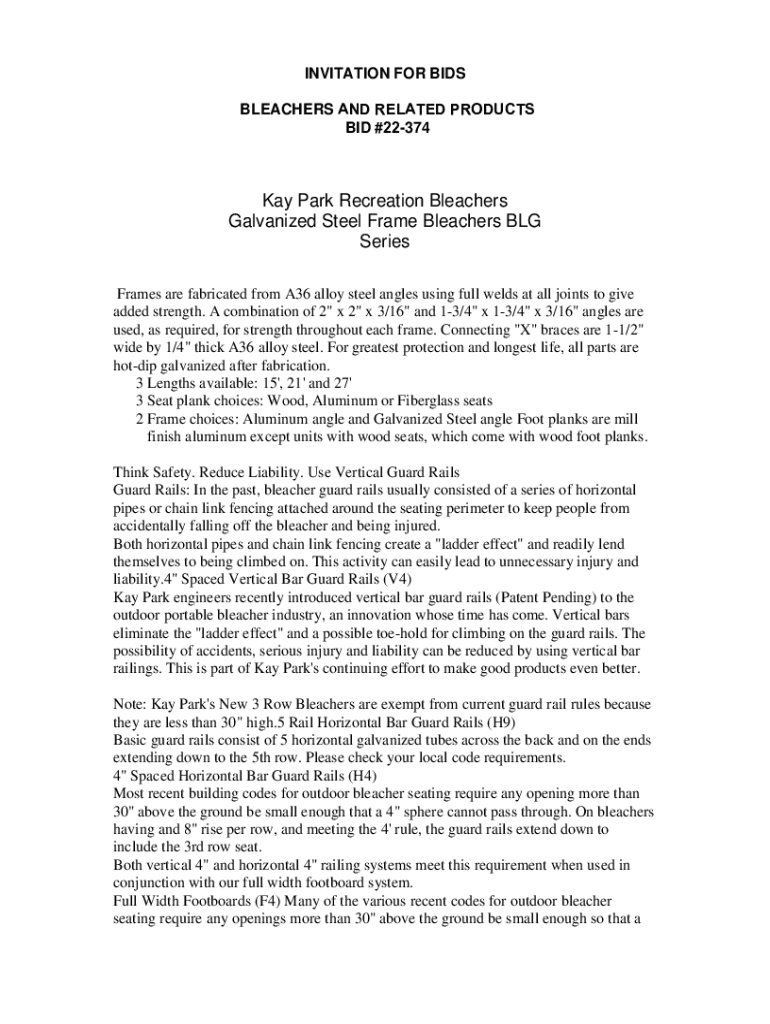 INVITATION FOR BIDS BLEACHERS AND RELATED PRODUCTS BID #22374Kay Park Recreation Bleachers Galvanized Steel Frame Bleachers BLG Series Frames are fabricated from A36 alloy steel angles using full