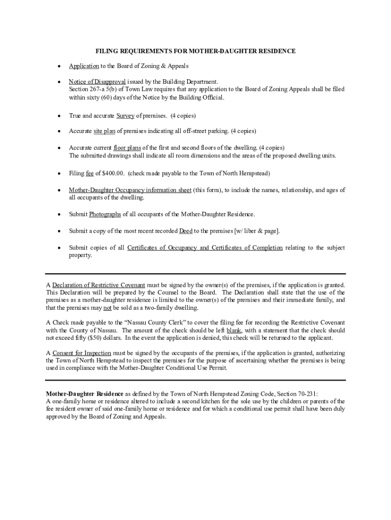 FILING REQUIREMENTS FOR MOTHERDAUGHTER RESIDENCE Application to the Board of Zoning & AppealsNotice of Disapproval issued by the Building Department. Section 267a 5(b) of Town Law requires that any