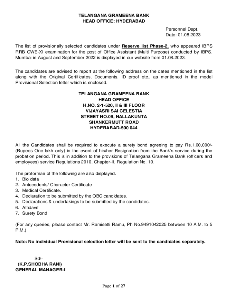 TELANGANA GRAMEENA BANK HEAD OFFICE: HYDERABAD Personnel Dept. Date: 01.08.2023 The list of provisionally selected candidates under Reserve list Phase2, who appeared IBPS RRB CWEXI examination for