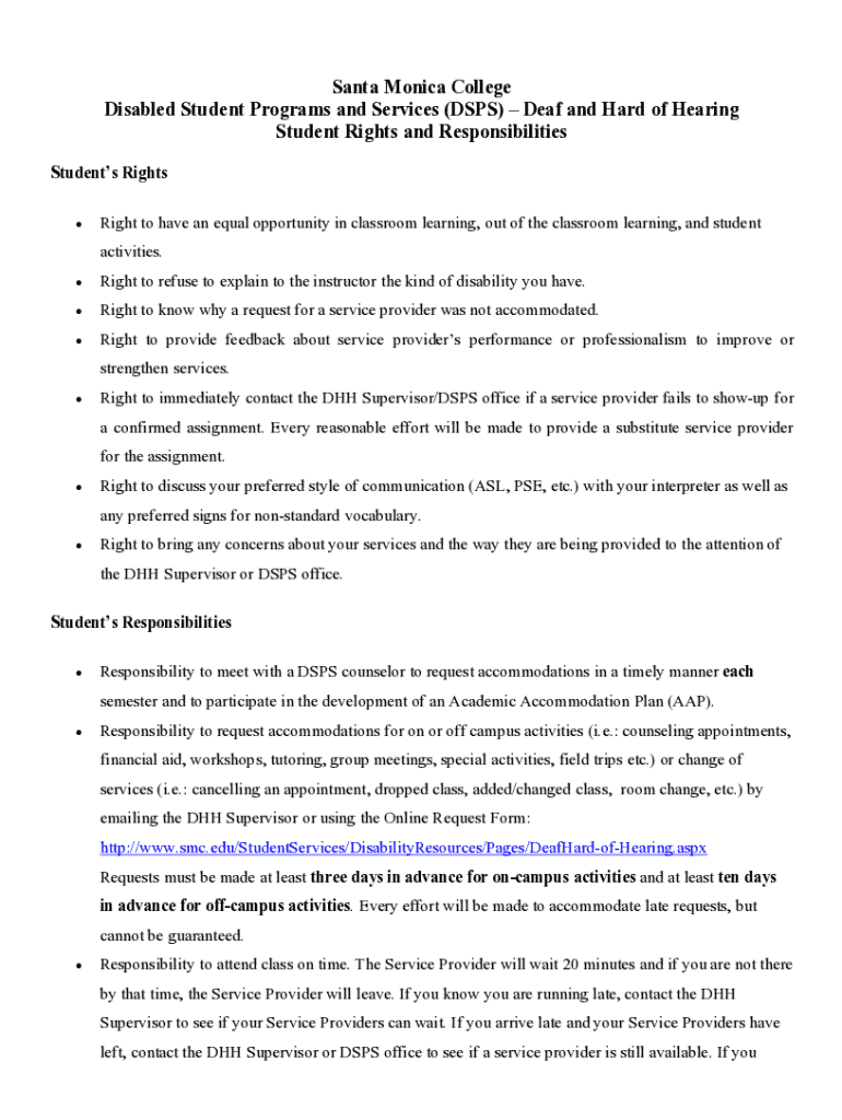Santa Monica College Disabled Student Programs and Services (DSPS) Deaf and Hard of Hearing Student Rights and Responsibilities Students Rights Right to have an equal opportunity in classroom learning,
