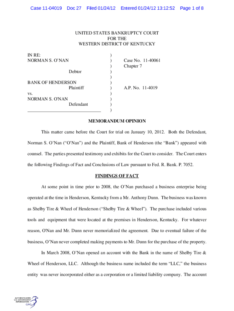 Case 1104019Doc 27Filed 01/24/12Entered 01/24/12 13:12:52Page 1 of 8UNITED STATES BANKRUPTCY COURT FOR THE WESTERN DISTRICT OF KENTUCKY IN RE: NORMAN S. ONAN Debtor BANK OF HENDERSON Plaintiff vs.