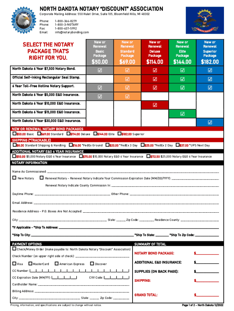 NORTH DAKOTA NOTARY DISCOUNT ASSOCIATION Corporate Mailing Address: 550 Hulet Drive, Suite 105, Bloomfield Hills, MI 48302 Phone: Phone: Fax: Email:18003668279 18003NOTARY 18006375992 info@notarybonding.comSELECT