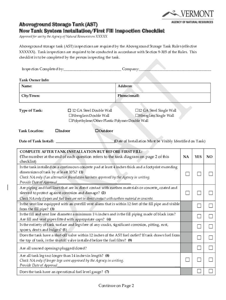 Aboveground Storage Tank (AST) New Tank System Installation/First Fill Inspection Checklist Approved for use by the Agency of Natural Resources on XXXXXAboveground storage tank (AST) inspections are
