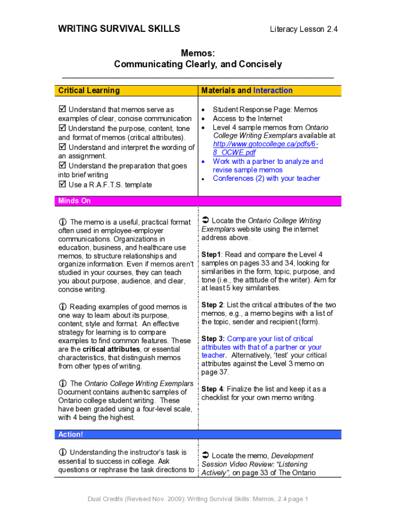 WRITING SURVIVAL SKILLSLiteracy Lesson 2.4Memos: Communicating Clearly, and Concisely ___ Critical LearningMaterials and Interaction Understand that memos serve as examples of clear, concise communication