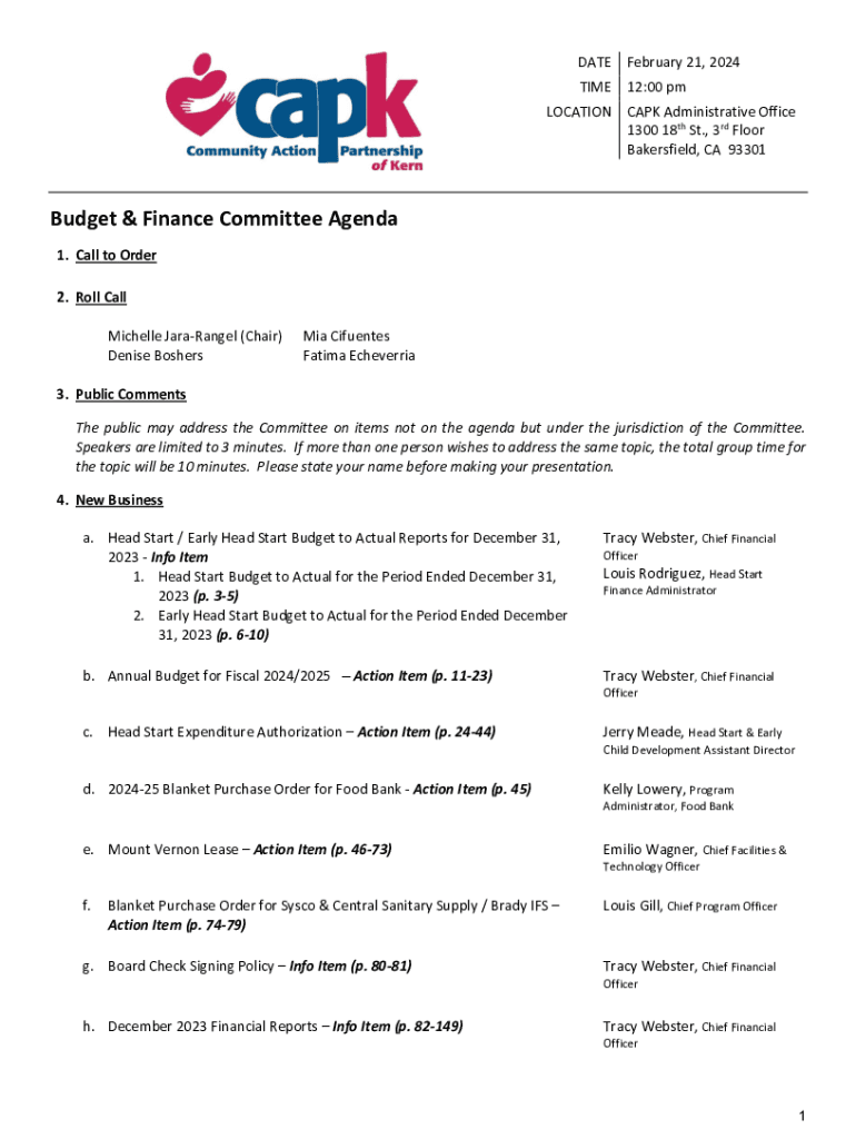 DATE February 21, 2024 TIME 12:00 pm LOCATION CAPK Administrative Office 1300 18th St., 3rd Floor Bakersfield, CA 93301Budget & Finance Committee Agenda 1. Call to Order 2. Roll Call Michelle JaraRangel