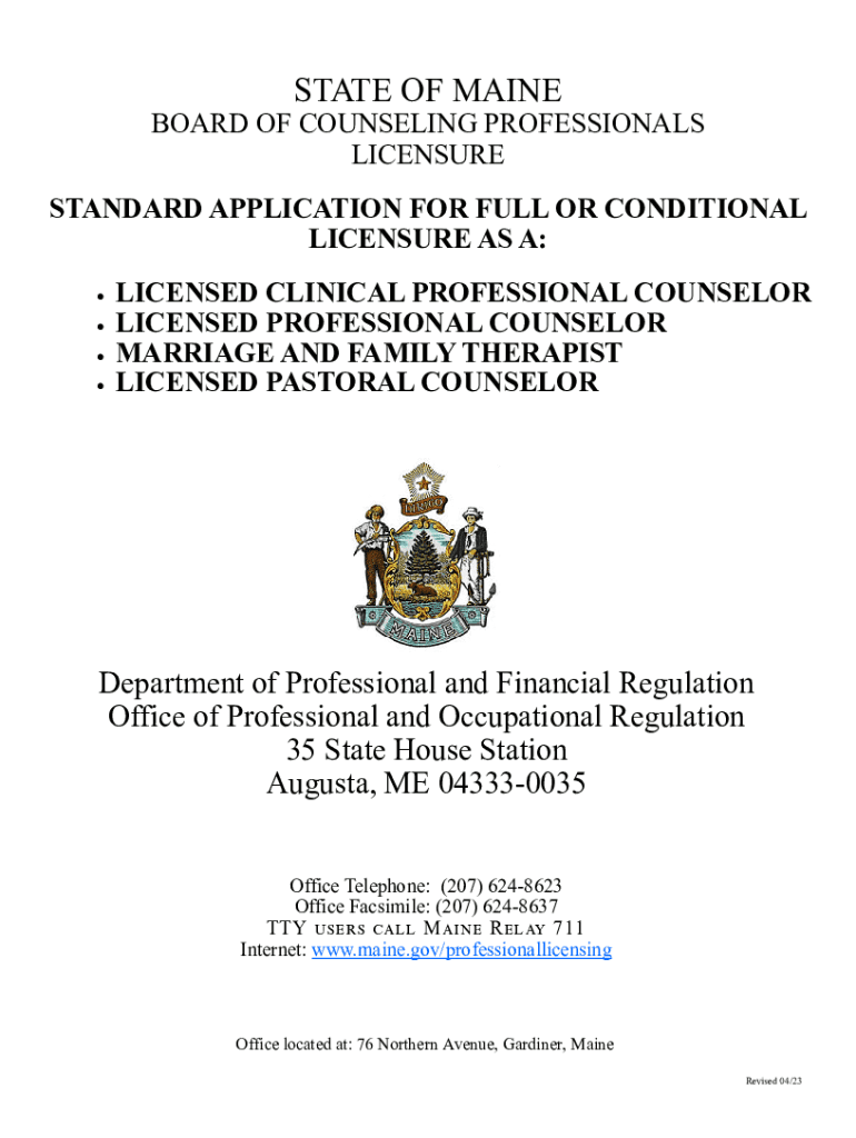 STATE OF MAINEBOARD OF COUNSELING PROFESSIONALS LICENSURE STANDARD APPLICATION FOR FULL OR CONDITIONAL LICENSURE AS A: LICENSED CLINICAL PROFESSIONAL COUNSELOR LICENSED PROFESSIONAL COUNSELOR MARRIAGE